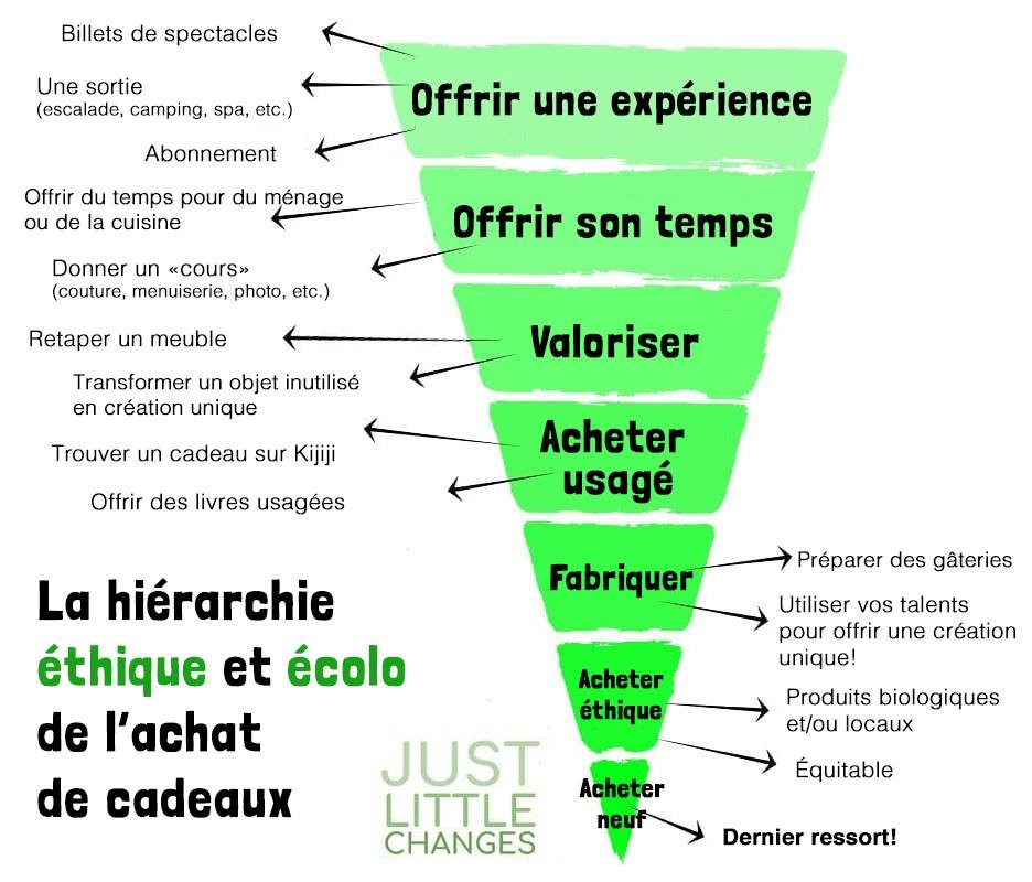 En termes de zéro déchet, l’élimination de cadeaux est certes l’option la plus évidente. Libre à vous d’affirmer que vous ne souhaitez pas en recevoir si vous êtes confortables avec cette décision. Reste que parfois, il est plus difficile de cesser d’en recevoir que de cesser d’en offrir! Vous pourriez alors choisir les cadeaux que vous souhaitez tout de même offrir tout en respectant votre tendance zéro déchet. Pour ce faire, la pyramide inversée, appliquée dans l’ordre, décline les différentes façons de consommer tout en limitant notre empreinte écologique :