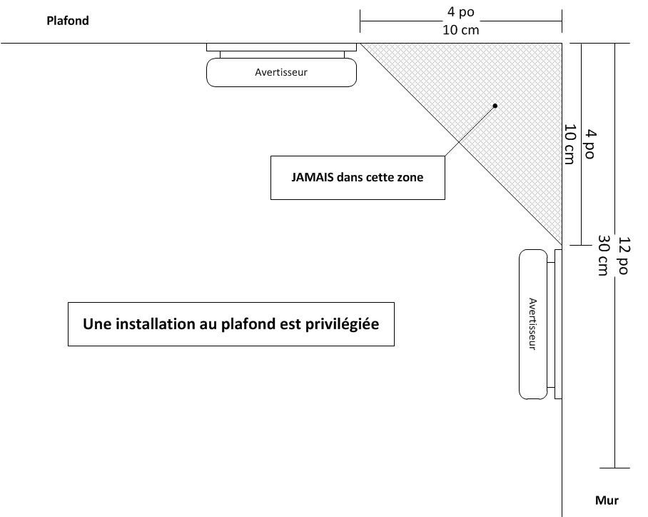EmplacementVous pouvez installer vos avertisseurs de fumée au plafond ou sur le mur. Par contre, il est préférable qu’il soit installé au plafond, à au moins 4 po d’un mur. S’il est installé au mur, il doit être à au moins 4 po et au plus 12 po du plafond.